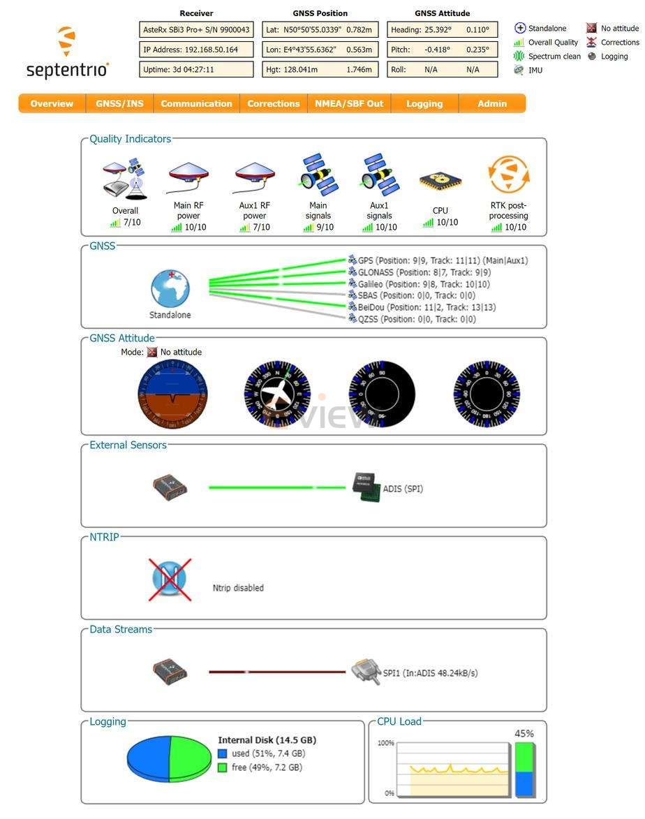 Septentrio reliable centimeter-level positioning is based on true multi-frequency, multi-constellation GNSS (GPS, GLONASS, Galileo, BeiDou, QZSS) technology. AsteRx SBi3 Pro+ combines GPS/GNSS and an industry-grade IMU (Inertial Measurement Unit) to deliver precise positioning together with 3D attitude (heading, roll, pitch). Septentrio’s unique GNSS – IMU integration algorithm enables continuous positioning in environments of low satellite visibility where short GNSS outages are possible. This is referred to as dead reckoning or coasting and can happen near high structures, under bridges or under thick foliage. This makes AsteRx SBi3 Pro+ a robust positioning solution for machinery operating in environments challenging for GNSS, such as in container yards, urban canyons or near cliffs.