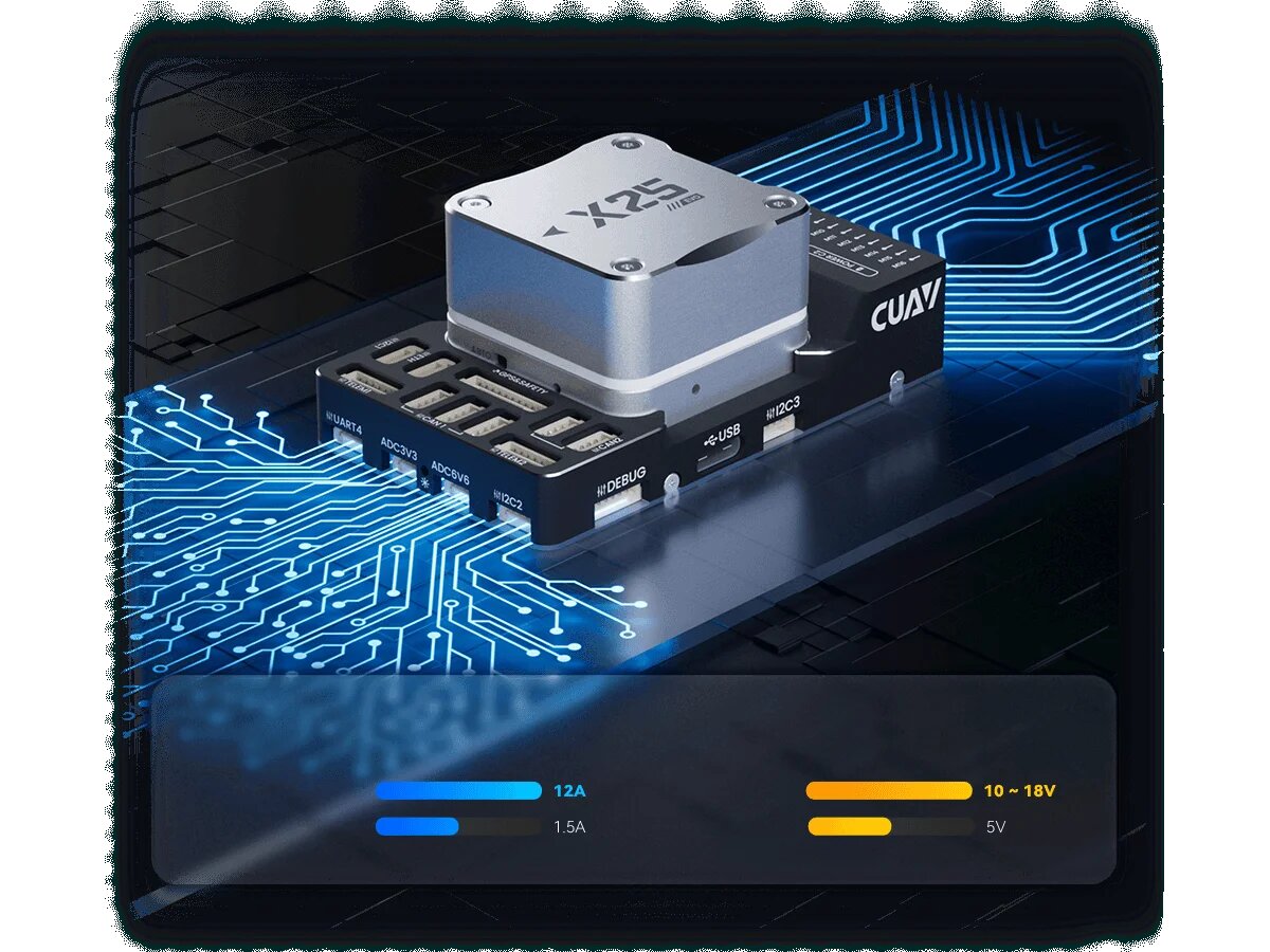 It adopts High-Performance STM32H7 processor, bringing powerful intelligent computing power to the system and supporting secure boot and secure firmware upgrade services. During operation, the CPU occupancy rate is lower, and it is compatible with the complete ArduPilot and PX4 drivers and functions (such as IMU temperature learning, non-GPS navigation, FFT filtering algorithm and LUA script, etc.), and provides ample space for follow-up development and compatibility with new drivers.